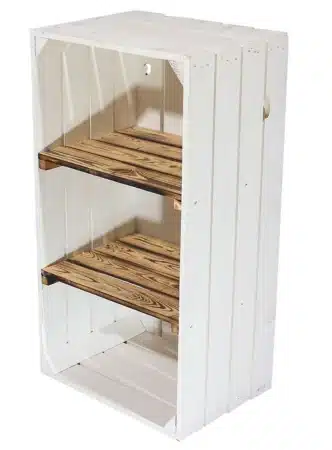 Die Gestaltungs,- und Einsatzmöglichkeiten bei weißen Obstkisten oder weiß lackierten Weinkisten ist grenzenlos, denn die stabilen Allrounder eignen sich sowohl als Aufbewahrungsmöglichkeit sowie zum Möbelbau ideal. Indem Du die Holzkisten miteinander verschraubst, kannst Du sie in Gruppen miteinander verbinden und Dir in Handumdrehen Deine eigenen Möbelstücke individuell selber bauen.